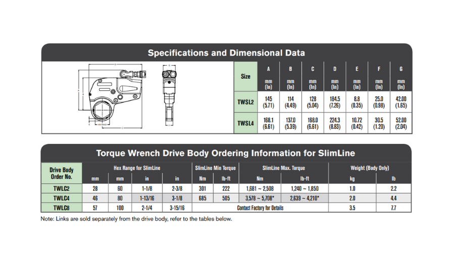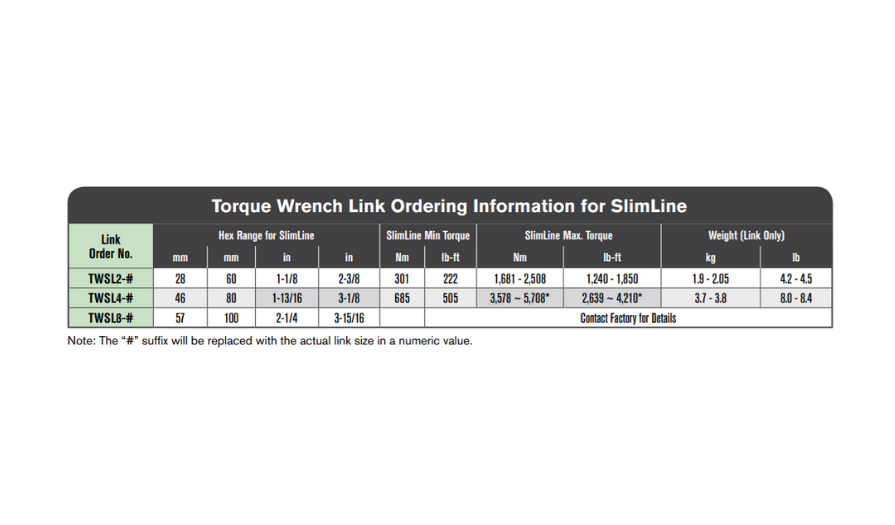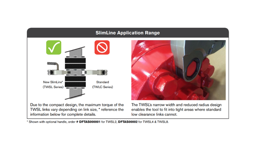 Cờ lê lực mỏng TWSL Series được thiết kế để đáp ứng nhu cầu cho một loại cờ lê có tính cạnh tranh nhất trên thị trường dầu khí. Chúng còn được biết đến rộng rãi về khả năng thích ứng cao trong các môi trường khó tiếp cận với độ hở tối thiểu.