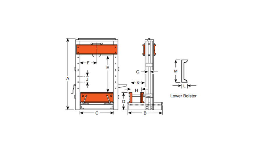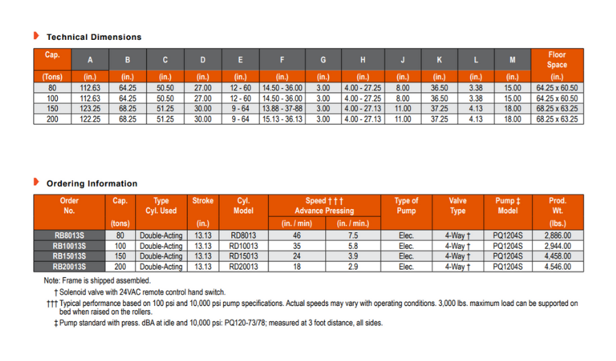 - Khoảng trống hành trình là 1283 mm x 1524 cho các mẫu 80 và 100 tấn; 1302 mm x 1625 mm trên những máy ép 150 và 200 tấn.